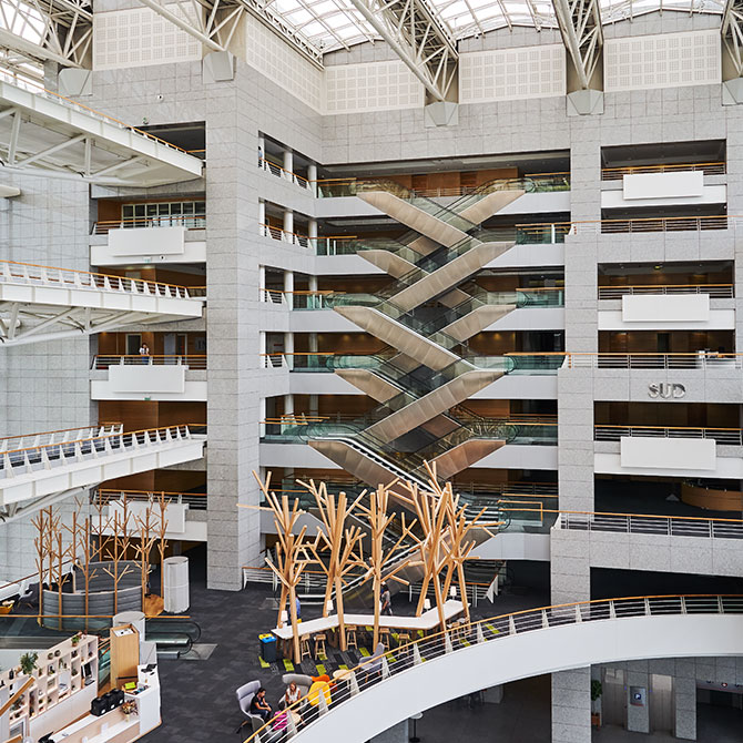Le Lumière compte sept étages supérieurs et se scinde en deux ailes reliées par un magnifique atrium. Le Lumière has seven upper floors and splits into two wings connected by a magnificent atrium. The building has two wings and totals almost 137,000 m2 offices, 4,000 m2 shops and restaurants, 28,000 m2 warehouses and archives, and 1,700 basement parking spaces. It is suitable for modern uses since it has a huge lobby, a reception service, a a 24-hour security team, and a remote maintenance service.