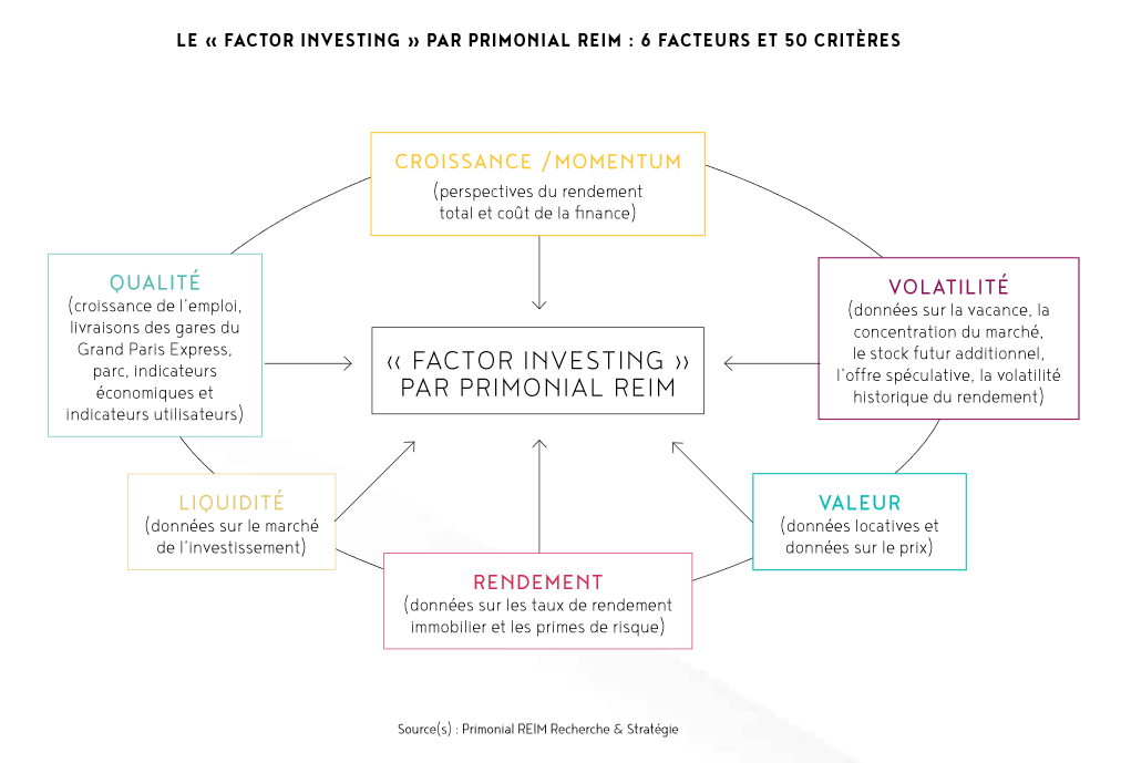 In this context, an analysis grid should be created in order to identify the markets where prices remain affordable and/or able to benefit from a favourable evolution to the rental market. Drawing inspiration from the finance sector, Praemia REIM Research and Strategy has developed an original tool for its investment strategies: “factor investing”. This approach consists of taking into account 6 factors that we have adapted to the real estate world across 50 criteria.