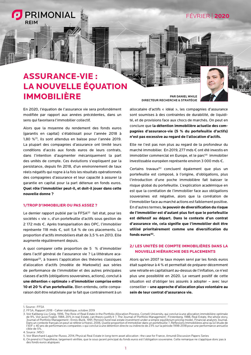 Alors que la moyenne du rendement des fonds euros (garantis en capital) s’établissait pour l’année 2018 à 1,80 %(1), ils sont attendus en baisse pour l’année 2019. La plupart des compagnies d’assurance ont limité leurs conditions d’accès aux fonds euros de leurs contrats, dans l’intention d’augmenter mécaniquement la part des unités de compte. Ces évolutions s’expliquent par la persistance, depuis fin 2018, d’un environnement de taux réels négatifs qui rogne à la fois les résultats opérationnels des compagnies d’assurance et leur capacité à assurer la garantie en capital pour la part détenue en fonds euros. Quel rôle l’immobilier peut-il, et doit-il jouer dans cette nouvelle donne ? Daniel While, Directeur Recherche et Stratégie, en fait l'analyse dans une nouvelle note.